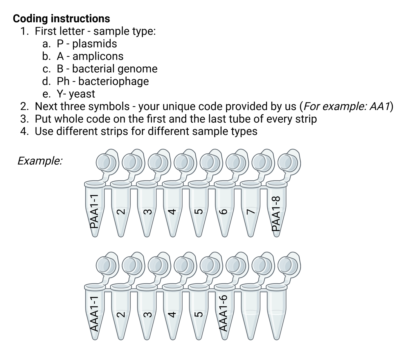 You can use this simple Google form to register for the service and get a unique code and example form to label your samples: